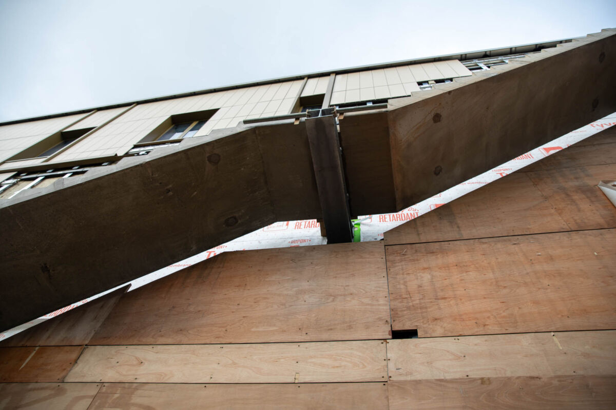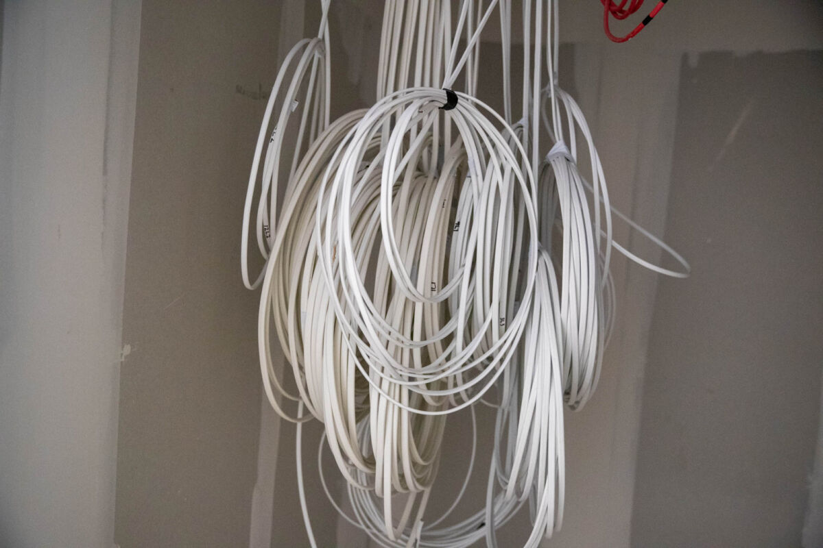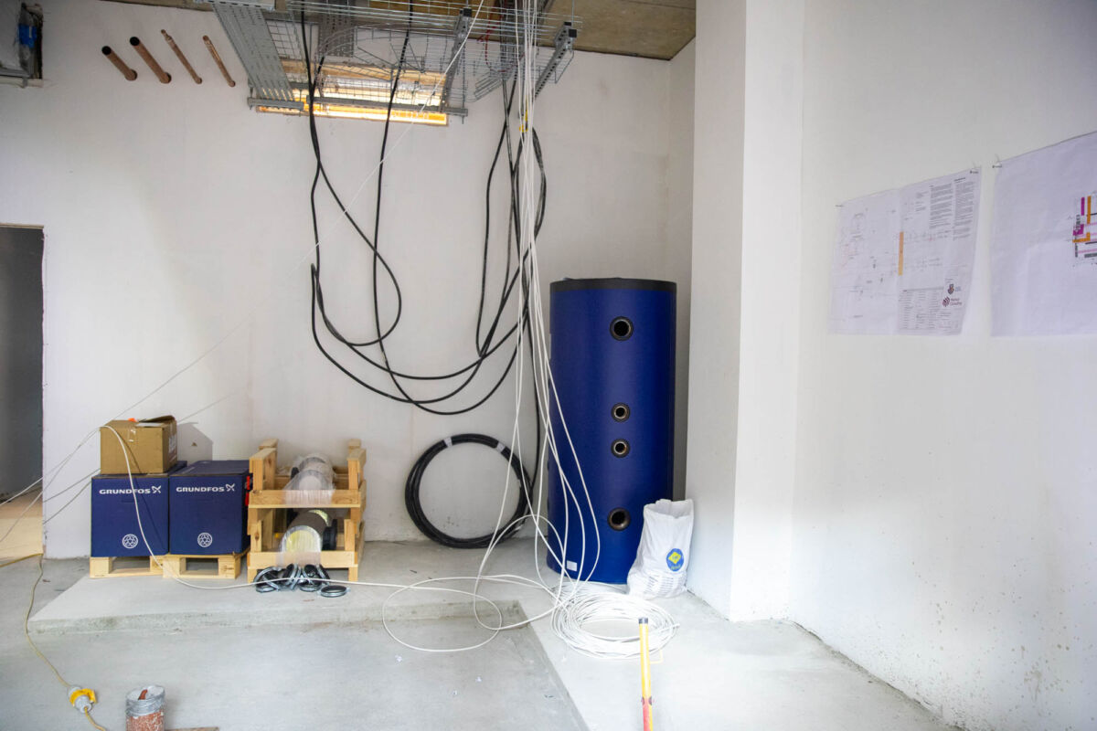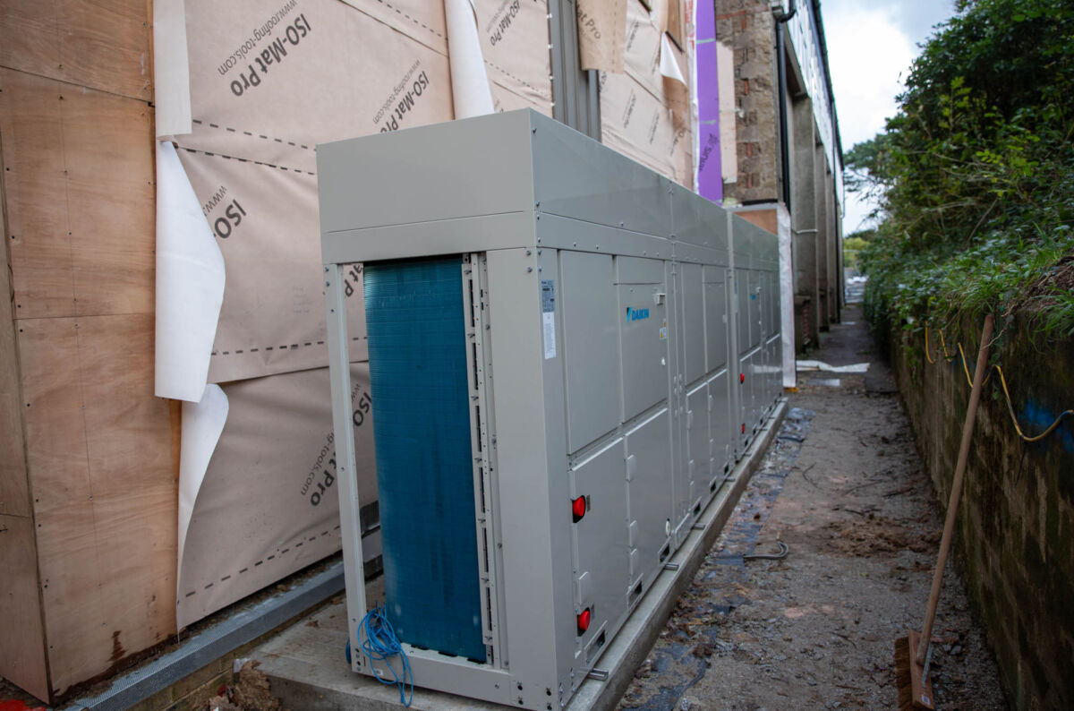 Now that the scaffolding and crane have been removed, you can see the building in all its glory. Getting close, we were able to awe the windows and brickwork and view the external staircase, which has just been established. Weighing in 3.5 tonnes each, the 4 staircases were quite a feat to get up Trennick Lane, along with the 100-tonne crane required to lift them into place. Alongside the staircases, the crane was also used to install the air-source heat pump units, which will be connected imminently to the pump room – the heart of the building.