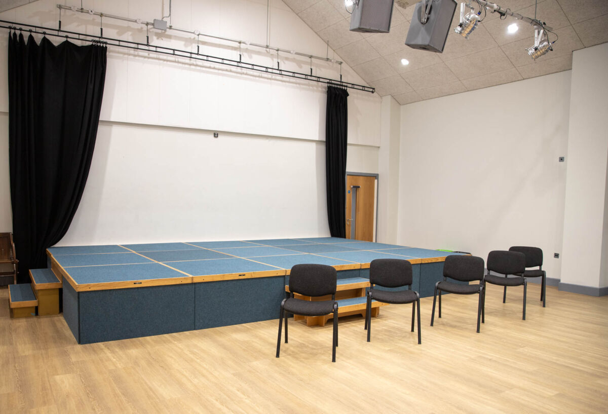 A highly adaptable space, with lighting, stage, toilets and on-site parking, the large room is perfect as an open space, or for seated events.