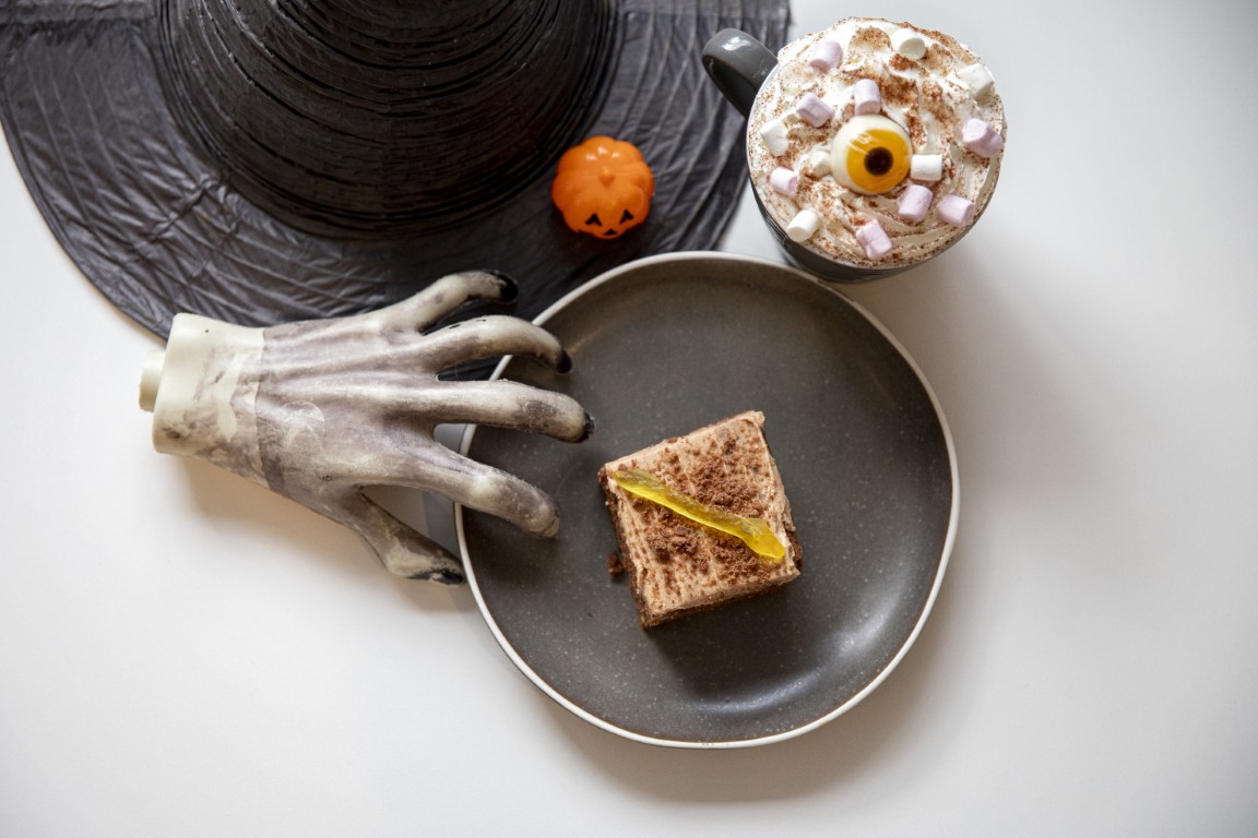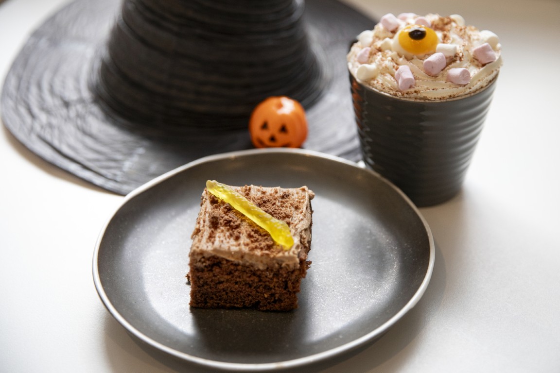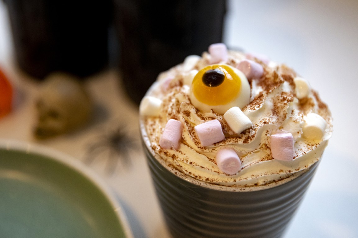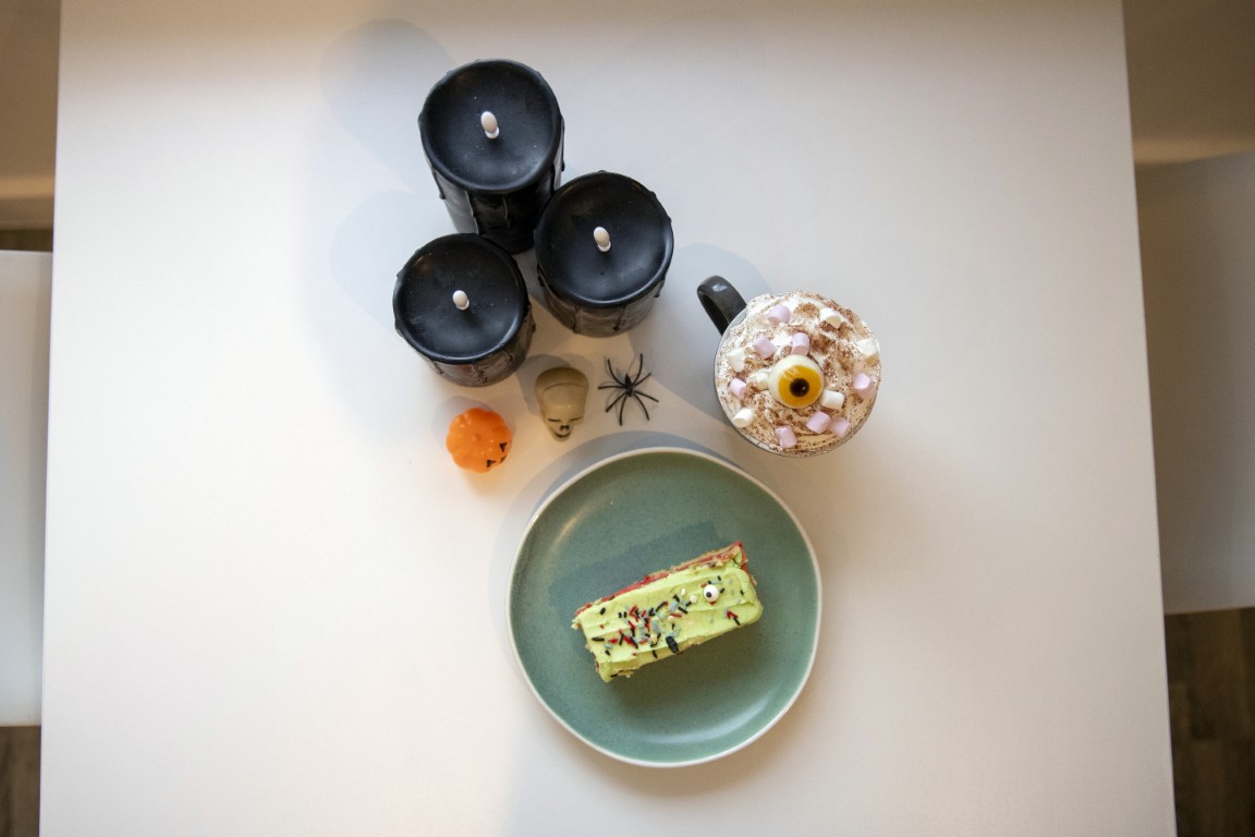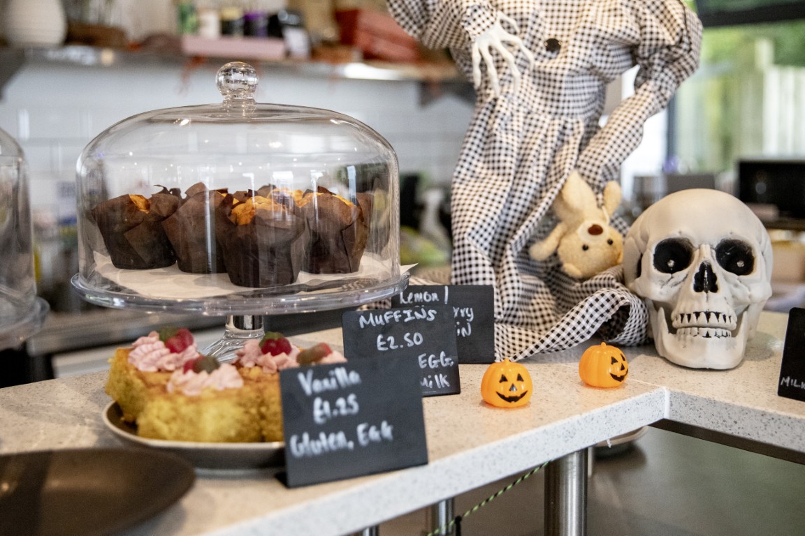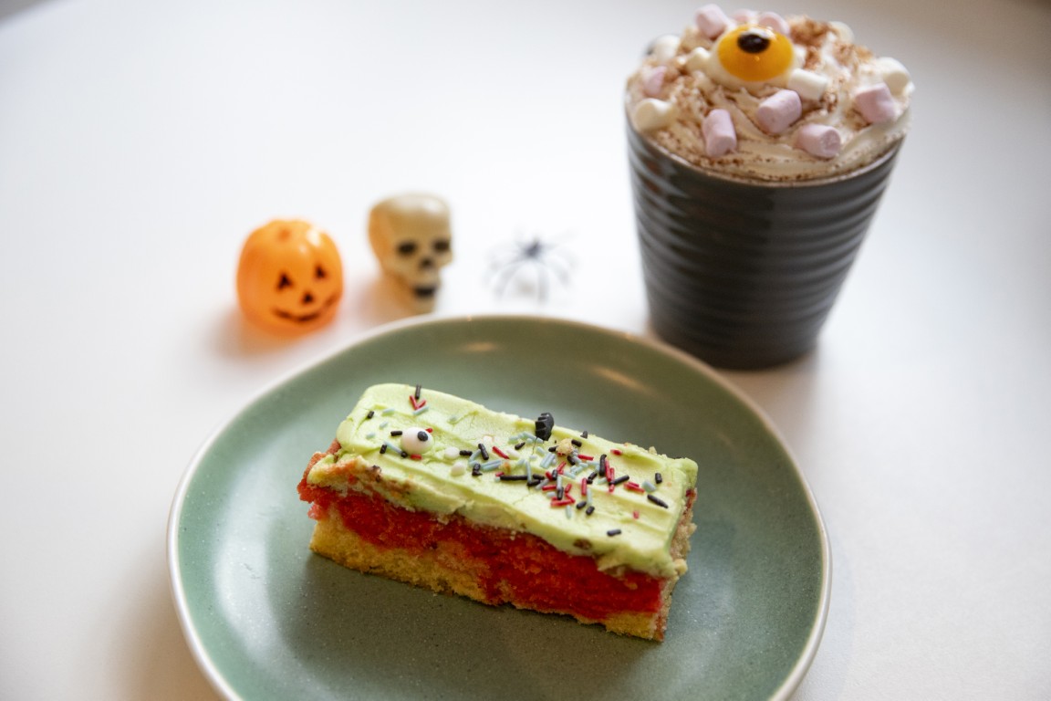 Spooky decorations adorn the windows, and more importantly, freshly baked Halloween-themed goods are now being served – such as brownies, caramel cake, chai cake, hot chocolate and lemon and blueberry muffins, topped with edible eyeballs, bats and snakes!