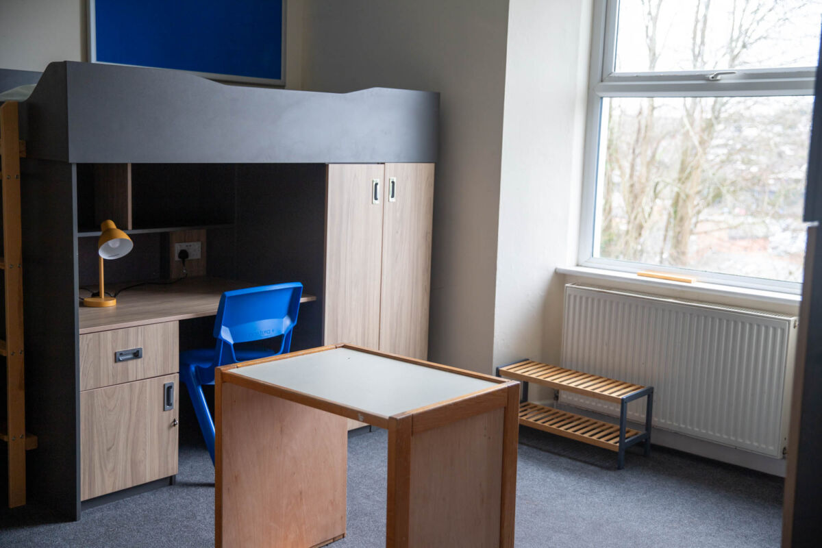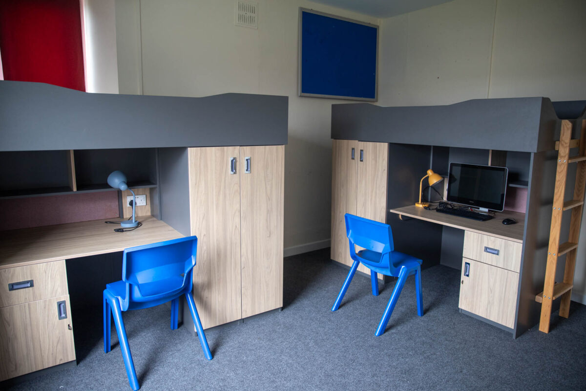 Bedrooms include a bed, wardrobe, desk, chair, mirror, lamp and waste bin, with natural light and views across the school grounds.